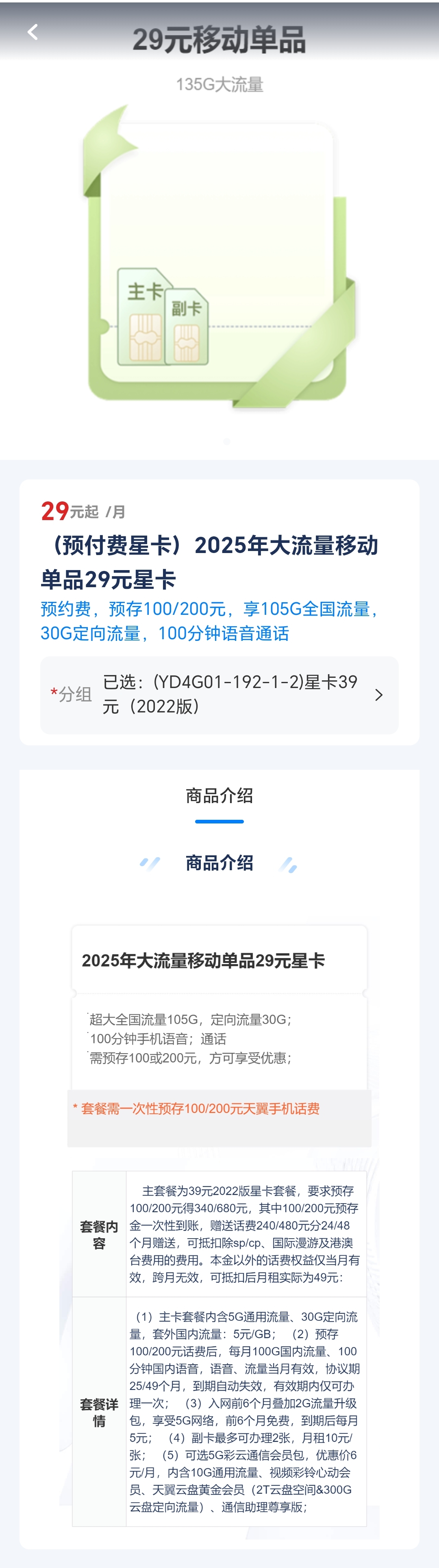 2025年大流量移动单品29元(原套餐39元)预付费星卡