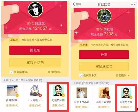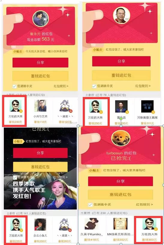 这只是其中一小部分,还有很多图是我后来补的,我当晚差不多以不高于200的价格,抢了十多个大V的前三名,你看到的其他人也基本都是大熊会成员,在跟我一起抢头条,这些位置,在红包最开始的时候,是可以给你引来自然流量的,你想,一个明星的粉丝,看到给他明星充红包的前三名,会不会好奇,自然就有人会加你的关注。这一点是很大的红利,也是有史以来最便宜的大V头条了,一直在第二天,我还在持续的补红包以保持这个位置,现在成本基本都上到了五百以上,效率下降了,我也就逐渐放弃了。这块的成本大概花了不到一万,值得一提的是,当天我一直抢到凌晨四点,和我一起抢到四点的,都是大熊名人堂的成员,基本都是月流水五百万以上,纯利百万以上的大咖。而同样群里的很多群友,虽然我一再提醒,也都是先睡觉了,明天再说。一个细节,可以看出做事的差别。